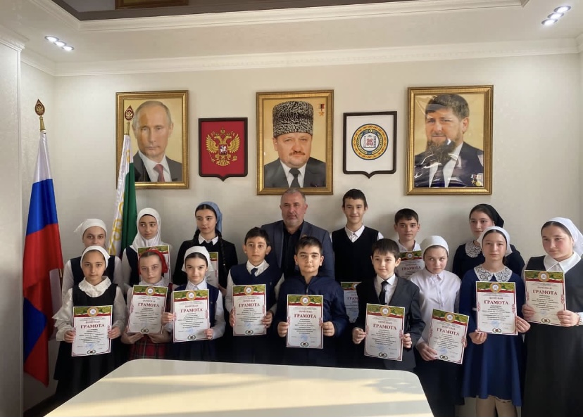 Ученица 8-го класса МБОУ «СОШ с.п. Зебир-Юрт» Юсупхаджиева Хадишат в очередной раз заняла первое место! В этот раз Хадишат стала победителем муниципальной олимпиады среди школьников 4-8 классов по русскому языку. Сегодня в актовом зале районного отдела образования начальник РОО Муцулханов Ильяс Султанович наградил победительницу грамотой!