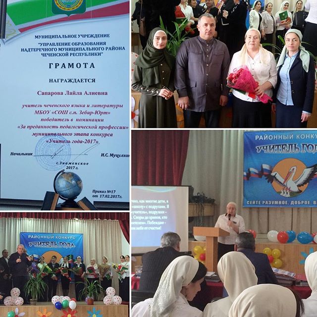 17.02.2017Учитель чеченского языка и литературы МБОУ "СОШ с.п. Зебир-Юрт" Сапарова Лайла Алиевна стала победителем муниципального этапа конкурса "Учитель года-2017" в номинации "За преданность педагогической профессии". Дала т1аьхье беркате йойла!