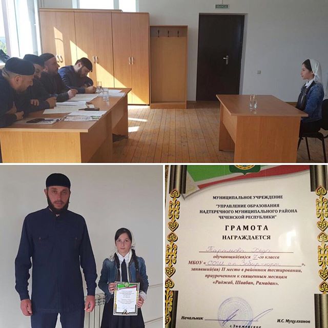 18.05.2017Ученица 7-го класса МБОУ «СОШ с.п. Зебир-Юрт» Тарамова Хеда награждена грамотой МУ «Управление образования Надтеречного муниципального района Чеченской Республики» за 2-е место в районном тестировании, приуроченном к священным месяцам «Раджаб, Шаабан, Рамадан». Дала т1аьхье беркате йойла!